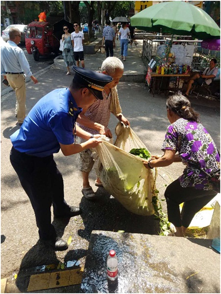 紧邻檀木林梅西广场旁边的大楻桶路,是大安区城管执法分局广华组一线协助执法人员卢秀丽工作的路段,这里地段复杂,人员结构复杂,对于卢秀丽来说,是一个不小的挑战。 早上5点起床,收拾妥当,骑车出发,6点50前必须赶到这里,开始一天的工作。一边劝说菜农菜贩不要在此摆摊,一边给他们讲相关法律法规,这种长时间的说话,常常让卢秀丽口干舌燥,尤其在夏天更加明显。“干这个其实需要互相理解,这么热的天,他们其实也不容易。”卢秀丽告诉记者,她希望菜农菜贩能理解自己的工作,同时,她也理解对方,有时候看到一些老年菜农背着菜或者推着菜,她也会上前帮忙扶一把。