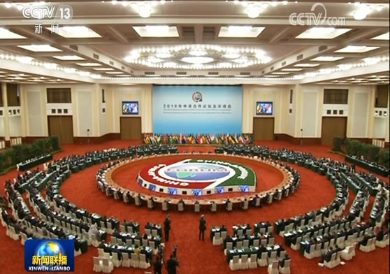 央视网消息(新闻联播):中非合作论坛北京峰会圆桌会议4日在人民大会堂举行。国家主席习近平和论坛共同主席国南非总统拉马福萨分别主持第一阶段和第二阶段会议。会议通过《关于构建更加紧密的中非命运共同体的北京宣言》和《中非合作论坛—北京行动计划(2019至2021年)》。 上午10时许,习近平同论坛共同主席国南非总统拉马福萨及其他53个论坛非洲成员代表团团长一同步入会场。习近平宣布会议开始。
