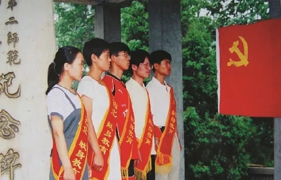 图为2000年部分毕业生在赴且末出发前在七六烈士纪念亭宣誓入党。新华网 你可能不知道的是 即使在新疆 且末也是最遥远的地方 它南临昆仑雪山 北临塔克拉玛干沙漠 他们不畏艰苦,扎根当地 用塑料棚搭建教室 用木墩当孩子座椅 把无悔的青春 奉献在讲台上
