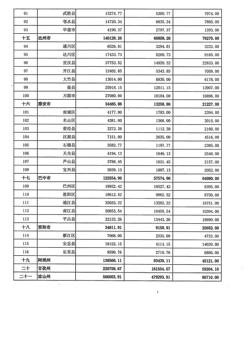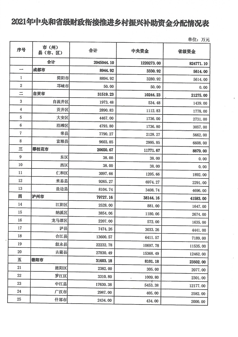 四川新闻网成都7月19日讯(记者 胡旭阳)记者获悉,根据《中央财政衔接推进乡村振兴补助资金管理办法》和《中央和省级财政衔接推进乡村振兴补助资金管理办法》规定,日前,四川省乡村振兴局、四川省财政厅发布2021年度中央和省级财政衔接推进乡村振兴补助资金分配情况公告。