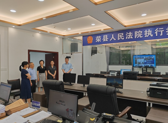 郑静春常务副院长一行实地查看了荣县法院执破融合中心、执行指挥中心,详细了解了“两个中心”实质化运行、团队建设、执行工作机制落实等情况,听取了荣县法院“执破融合”工作理念、繁简分流运行流程介绍,高度肯定了“执破融合”试点工作。