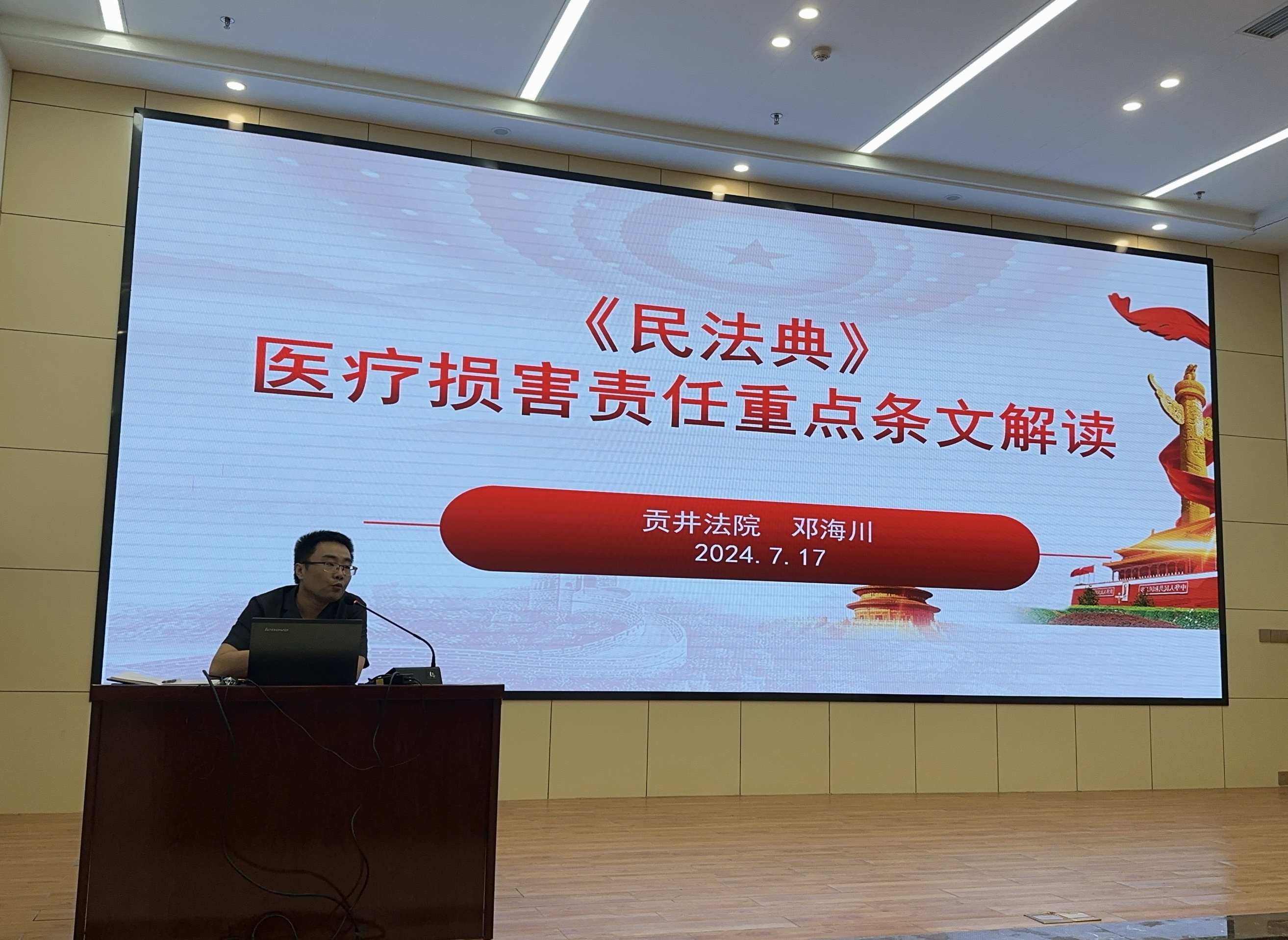 贡井法院红梅党员法官工作室驻点法官邓海川以《医疗损害责任重点条文解读》为主题,为西南医科大学附属自贡医院新入职的医护人员带来了一场生动详实的法治讲座。讲座围绕医疗损害责任纠纷中的法律焦点,对医疗损害责任的定义、构成要件、归责原则以及民法典中明确的医疗机构法定义务等方面进行了解读,细致剖析了医疗损害责任的内涵以及如何防范医疗法律风险,提醒医护人员要依法依规开展诊疗活动,从源头上预防和减少医疗纠纷。与会医护人员纷纷表示此次讲座对即将入职的他们帮助极大,对保障医疗安全、构建和谐医患关系具有很强的实用性和指导性。