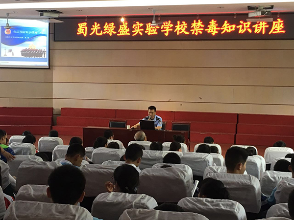 四川新闻网自贡6月19日讯(肖雪松)为推进青少年毒品预防教育“6·27”工程深入开展,提高青少年拒毒、防毒的意识和能力, 6月16日下午,高新区禁毒办走进蜀光绿盛实验学校南湖校区,为学校师生举办了以一场“为爱相聚,拥抱未来,无毒无悔”为主题的禁毒知识讲座。绿盛学校师生共计300余人参加了活动。  | | 现场 |