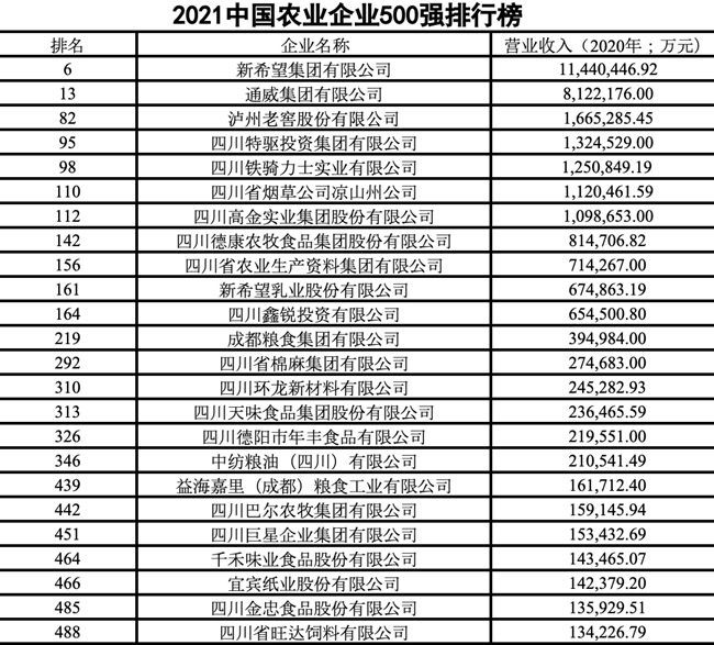 原标题:2021中国农业企业500强发布 四川24家入围 |