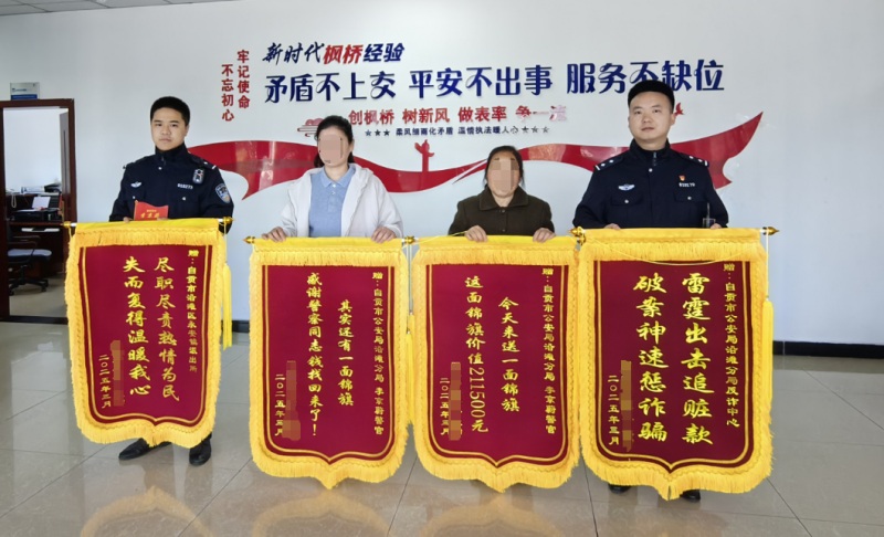 “今天来送一面锦旗,这面锦旗价值211500元,其实还有一面锦旗,感谢警察同志,钱找回来了!”